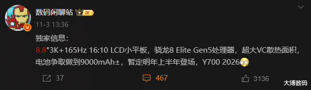 从市场角度来看,小尺寸高性能平板依然拥有稳定的受众群体。联想拯救者Y700 2026款凭借其骁龙8至尊版处理器、3K/165Hz高刷屏、升级的电池与散热系统,清晰地延续了其“性能小钢炮”的产品定位。