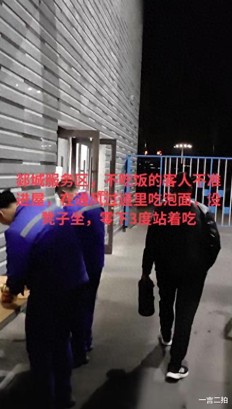 12月18日,山东临沂郯城服务区发生了一件让人心寒的事情。有网友发布视频称,在寒冷的冬夜,气温降至零下3℃,他们因为没有在服务区内消费而被禁止进入室内,只能在室外的过道里站着吃方便面,连个坐的凳子都没有。
