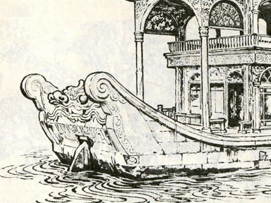 分镜 16:近景刻画石舫的船头,石舫雕刻成船形,有栏杆,船头有龙头装饰,水面波纹荡漾。文字说明:“石舫船头,栏杆精致,龙头昂首波中荡。”