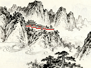 分镜 30:远景展示群峰中的山寺,寺庙依山势而建,红墙(线描轮廓)隐约可见,山间云雾弥漫。文字说明:“群峰环抱古山寺,红墙隐现云雾中,山势层叠寺幽静。”