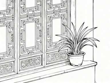 分镜 2:近景描绘楼阁的雕花窗棂,窗格呈回字纹,窗台上摆放着一盆兰草,叶片舒展。文字说明:“雕窗回纹,兰草一盆,窗台静立吐芬芳。”