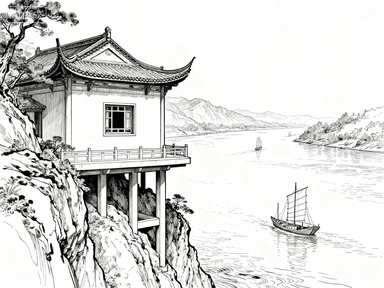 分镜 26:中景描绘江边楼阁,楼依峭壁而建,底层架空,上层开窗望江,江面有帆船驶过。文字说明:“峭壁临江楼阁立,底层架空上层窗,帆影点点过江面。”