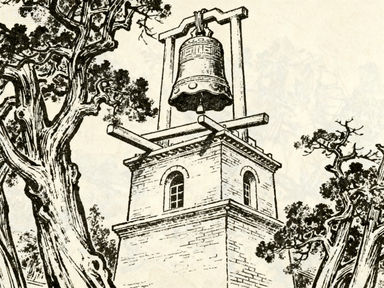 分镜 15:中景描绘一座钟楼,楼顶有巨大钟体,钟下有横梁,楼体有拱形窗,周围有古柏。文字说明:“钟楼高耸,巨钟悬梁,古柏环绕岁月深。”