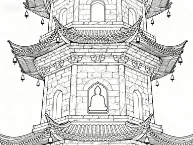 分镜 24:近景刻画石塔的塔檐,每层塔檐出挑,角挂风铎,塔身有佛龛(线描轮廓)。文字说明:“石塔层檐,风铎轻悬,佛龛隐约塔身间。”