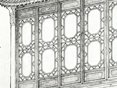 分镜 29:局部特写楼阁的菱花槅扇窗,窗格为几何图案,窗棂纤细,窗纸(线描留白表现)微鼓。文字说明:“菱花槅扇窗格巧,几何纹样棂纤细,窗纸留白显通透。”