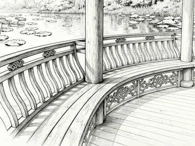 分镜 17:近景展现水榭的美人靠,木质栏杆弯曲成弧形,栏上有简单雕花,榭外水面漂浮几片荷叶。文字说明:“水榭美人靠,弧栏雕花,荷叶片片浮水面。”