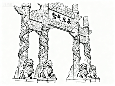 分镜 5:侧面描绘一座牌坊,牌坊上刻有 “紫气东来” 四字,柱子上有盘龙雕刻,牌坊下有石狮子蹲坐。文字说明:“牌坊矗立,‘紫气东来’,盘龙柱下石狮蹲。”