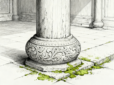 分镜 21:局部特写廊柱础石,石上雕刻缠枝纹,柱体与础石衔接自然,地面有青苔痕迹。文字说明:“廊柱础石,缠枝纹样,柱石相衔苔痕浅。”