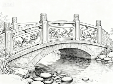 分镜 8:近景刻画一座石桥,桥身有石栏,栏板上雕刻着花鸟图案,桥下有流水,水中有鹅卵石。文字说明:“石桥石栏,花鸟雕刻,桥下流水石卵圆。”