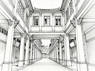 分镜 23:中景描绘带骑楼的商业街建筑,楼下廊道连通,楼上开窗,檐下有斗拱装饰。文字说明:“骑楼连廊,檐下斗拱,商铺林立古街景。”