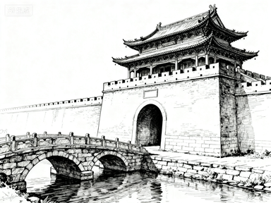 分镜 20:侧面刻画城门楼,门洞高大,上方有城楼,楼前有护城河,河上石桥连通。文字说明:“城门高耸,城楼巍巍,护城河上石桥横。”