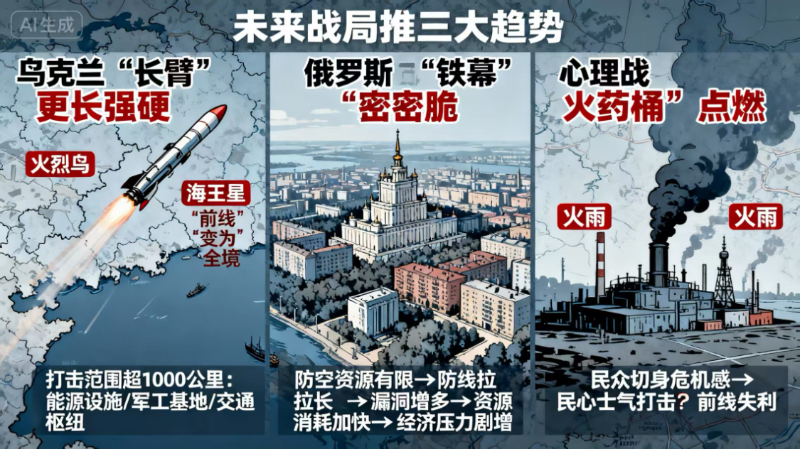 “火烈鸟”和“海王星”导弹的成功运用,证明了乌克兰国产远程打击能力的成熟。接下来,打击范围超过1000公里的俄罗斯腹地,如能源设施、军工基地、交通枢纽,都将可能成为常态化的攻击目标。战争将从“前线”彻底变为“全境”。