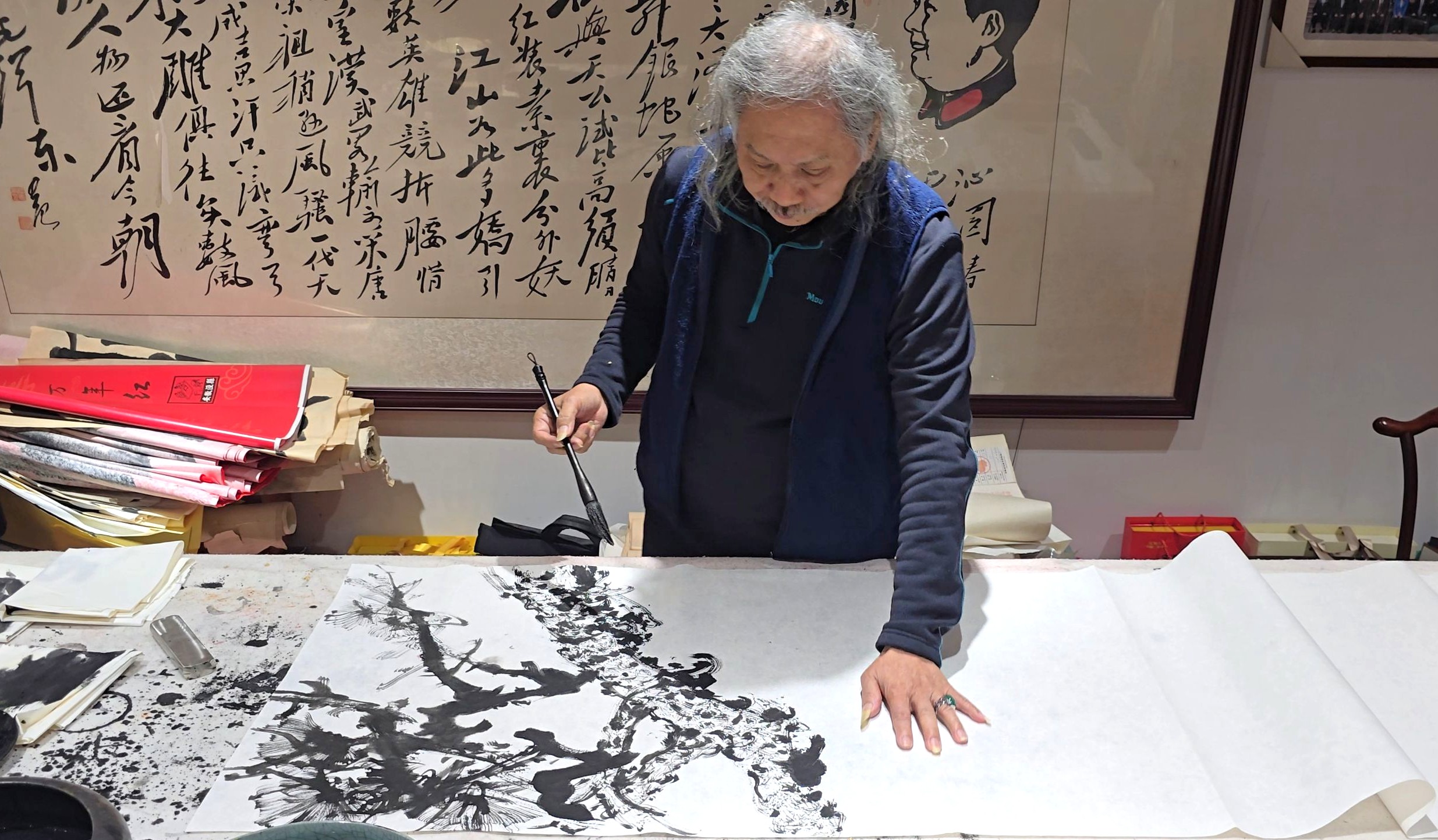 何木火大师作画神态专注,岭南苍茫雄浑跃然纸上。
