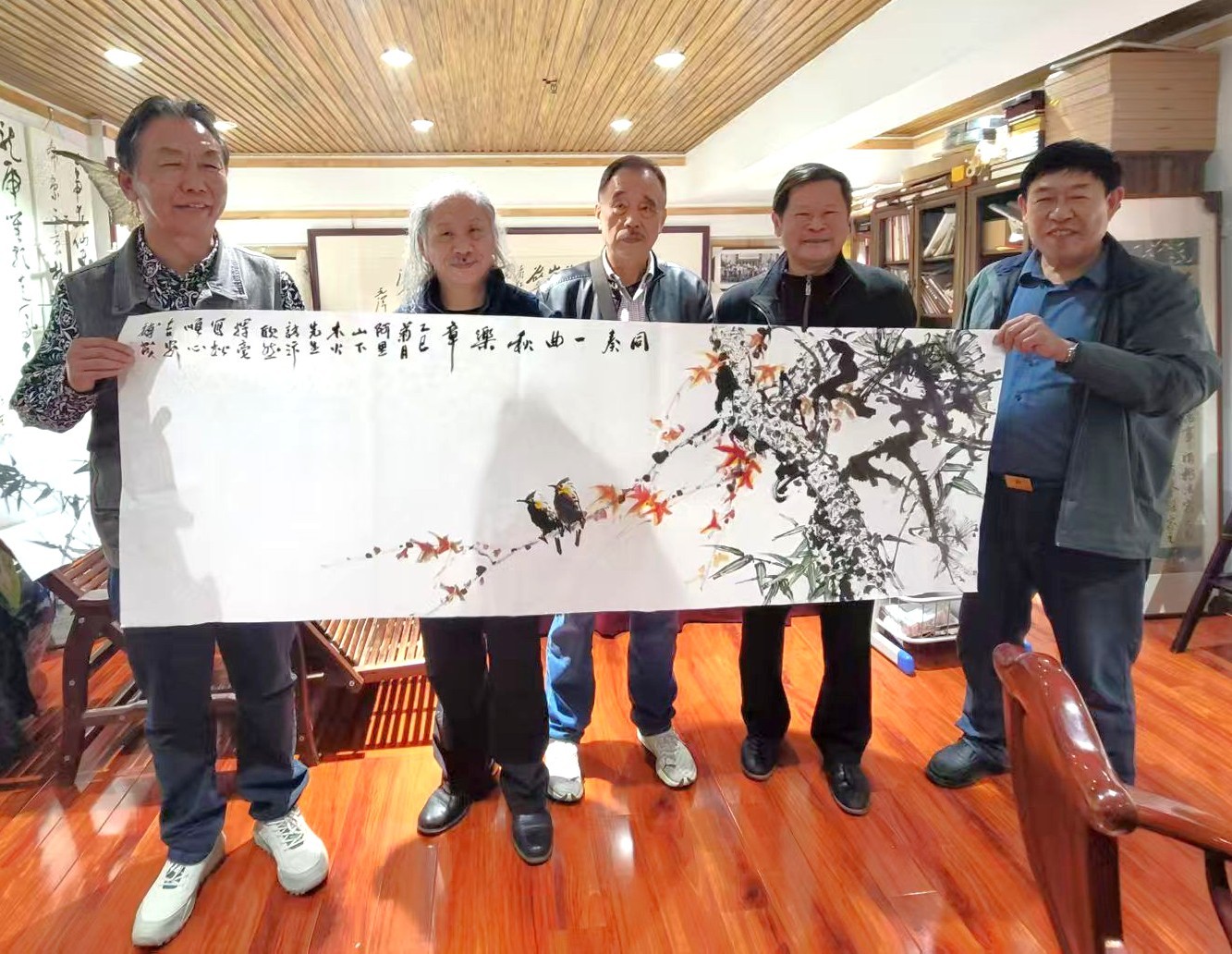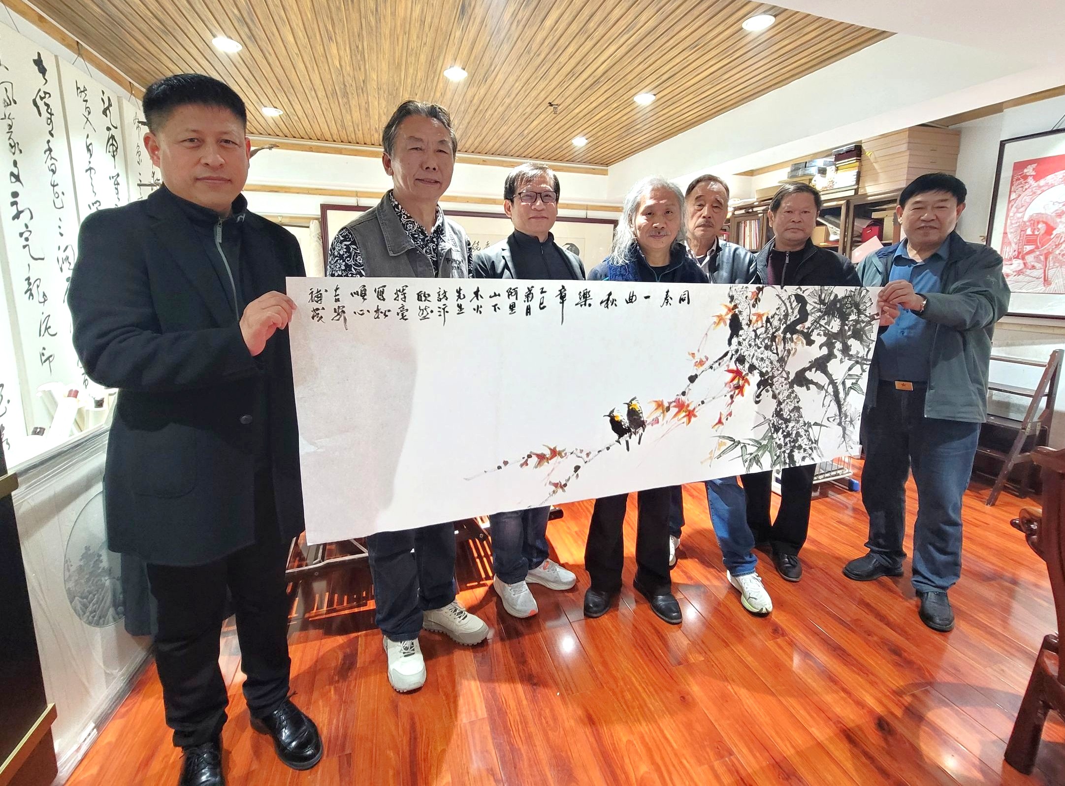 下午三点,此行重中之重的时刻终于到来:开封市美术馆魏吉安馆长、河南民建书画院院士王顺心与台湾何木火大师齐聚“无同轩”,共同挥毫创作。短短半小时便完成了一幅气势恢宏、寓意深远的佳作,不仅为两岸书画交流写下崭新篇章,更是一场心灵的盛事。当日共襄盛举的著名水墨大师们有赵振乾、宗致远、李健、刘艳会、杜大伟、张涛、杨惠君、杨恢、王保东及杨惠武等领导和书画名家,齐聚一堂,堪称两岸水墨界难得盛事。