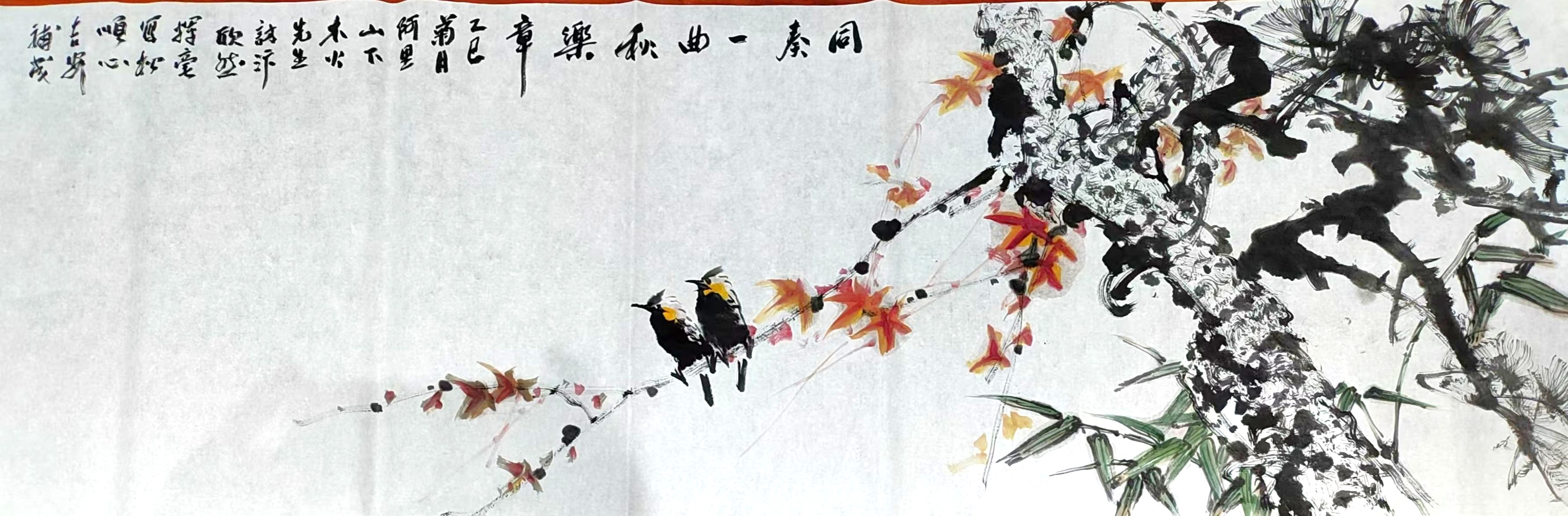 这幅凝聚两岸情谊的画作充满中华传统文化的精神象征:何木火大师勾勒出苍劲有力的松干枝桠,尽显岭南画派的雄浑奔放,象征着中华民族坚韧不拔的精神底蕴;王顺心大师则以疏朗有致的高洁竹叶穿插其间,寓意君子常青与虚怀若谷。在苍松翠竹的掩映下,魏吉安大师红艳的丹枫点缀秋意,使画面色彩鲜明而富有生机。枝头上一对相依相偎、神态灵动的黄鹂鸟,生动象征着“两岸同根、比翼齐飞”的深厚情谊与未来信心。魏吉安上方题跋“同奏一曲秋乐章”,不仅是艺术家创作心境的写照,更寄托了对两岸和平发展的深切期许。