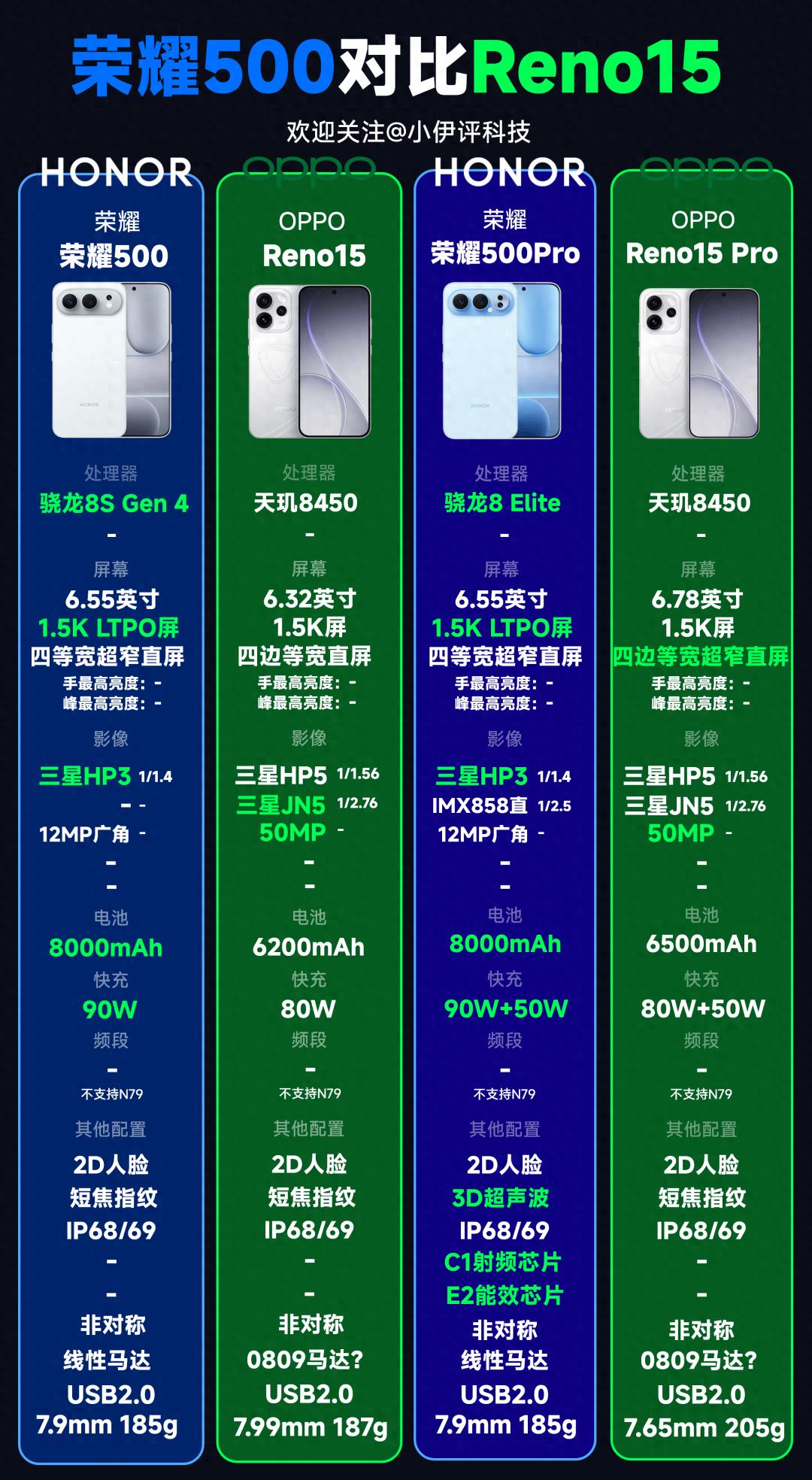 这个月要发布的两款比较重要的产品,一款是OPPO Reno 15系列,另外一款就是荣耀的500系列,不出意外,这俩机器的价格是完全对位的,互为竞品。