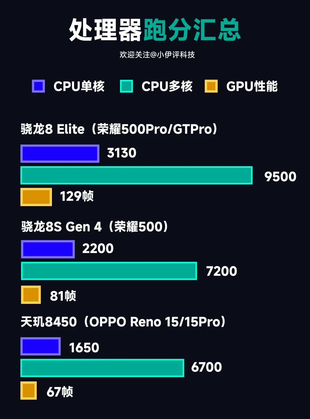 从处理器性能这个维度来看,荣耀500系列对OPPO Reno 15系列形成了标准版默秒全的态势——荣耀500标准版就秒了OPPO Reno 15全家,骁龙8S Gen 4虽然不是啥性能U,但是打一打天玑8450还是绰绰有余的。
