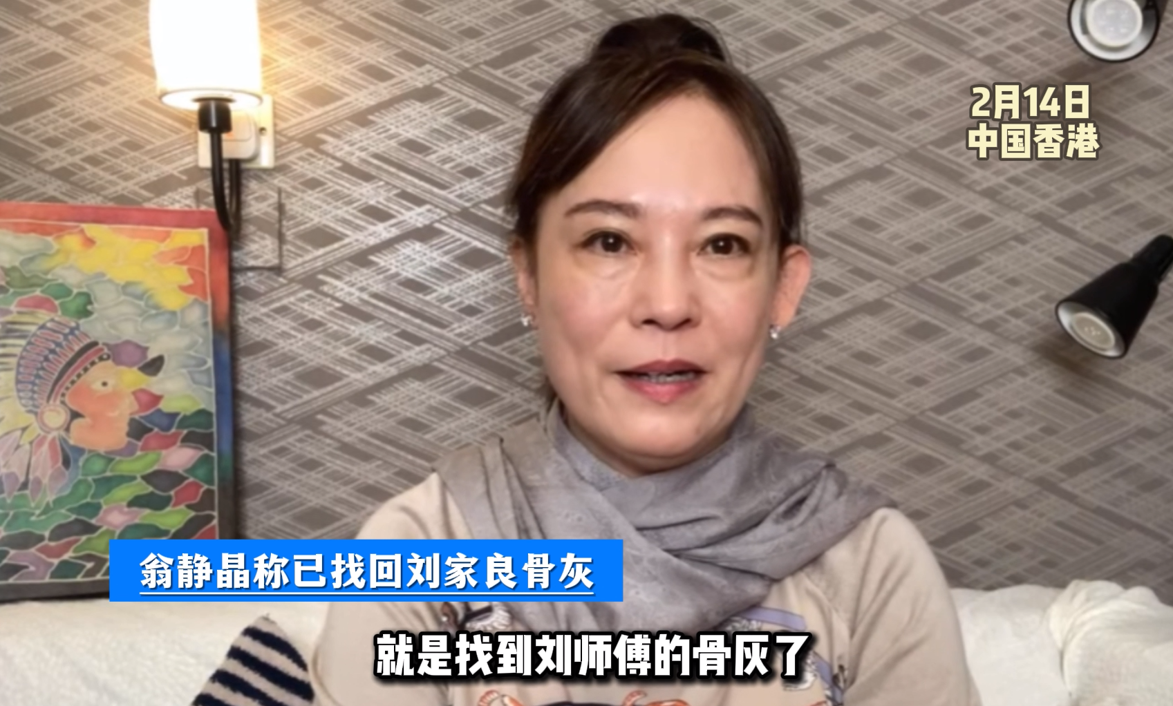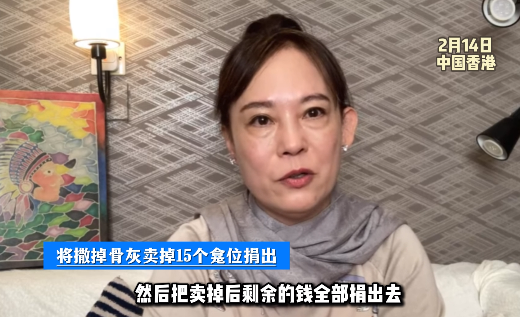 香港著名演员刘家良的骨灰去年5月被盗,遗孀翁静晶在2月14日发布视频表示已找回骨灰了,接下来会把骨灰撒入大海,然后卖掉15个龛位做善事,预计1500万。