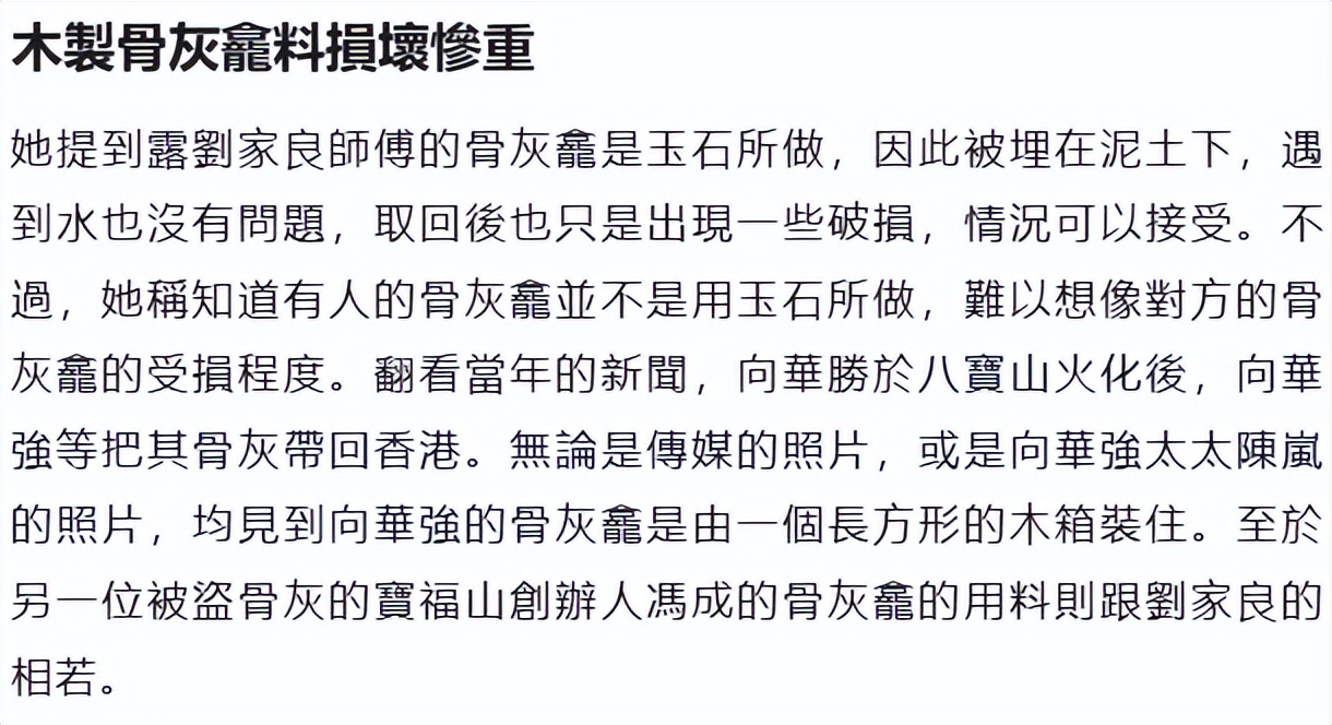 她还说因为刘家良的骨灰盒是玉石做的,拿回来的时候没什么破损,但有的骨灰盒不是玉石做的,可能严重受损。