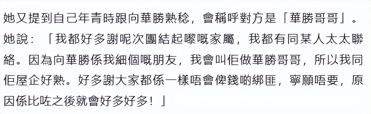 翁静晶表示和向华胜的关系要好,称呼他为“华胜哥哥”,因为向家的大当家“向华炎”去年病重,所以翁静晶一开始没有联系向家,现在要感谢向华胜的妻子,大家团结起来不给赎金。