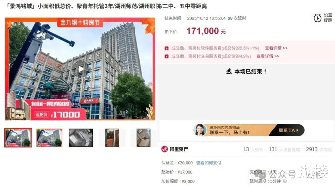 10月12日,湖州老城区景鸿铭城一套商品房,经过竞拍后最终以17.1万元成交。