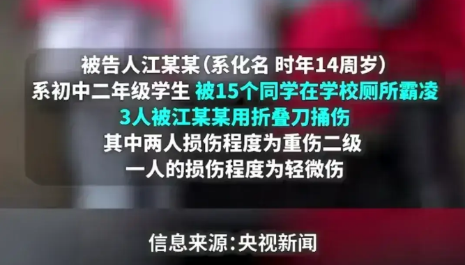 达到厕所后,江某某遭到胡某等 15 人的围殴。情急之下,江某某掏出折叠刀乱挥,悲剧发生了。3 人被折叠刀捅伤,其中,一人腰背部被捅伤,一人腹部被刺伤,一人大腿被划伤。惊骇之下,其他人一哄而散。随后,这三人被及时送往学校医务室治疗,暂无性命之忧。经鉴定,其中两人的损伤程度为重伤二级,另外一人的损伤程度为轻微伤。