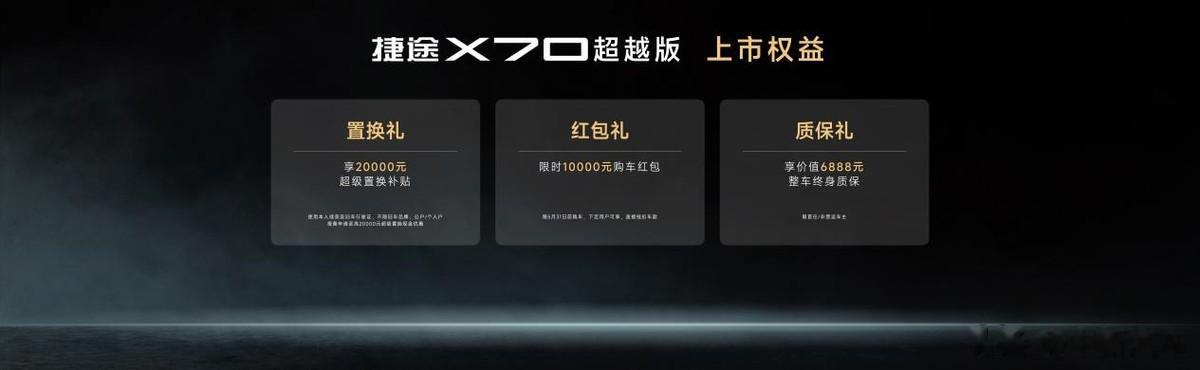 发布会现场,2026款捷途X70超越版的官方指导价及专属购车权益正式公布。2款车型官方指导价9.99万元-10.39万元,提供3重购车豪礼,限时抢购价6.99万元-7.39万元,让更多家庭轻松拥有顾家派宽体大七座,奔赴向往的生活。