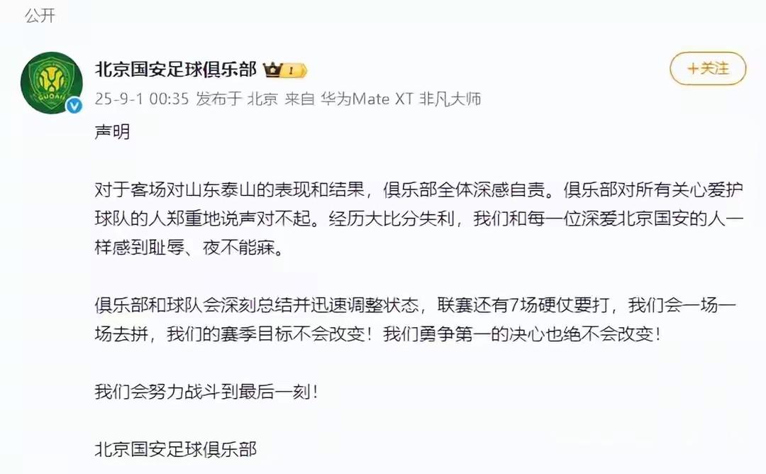 “知耻而后勇”,国安的深夜道歉或许能安抚球迷情绪,但真正的考验才刚刚开始。间歇期过后,国安将客场挑战河南队,若不能迅速调整状态,争冠梦恐成泡影。球迷们不禁要问:这支国安,究竟是缺乏实力,还是缺乏斗志?答案,或许就在接下来的7场硬仗里。(作品声明:内容取材于网络)