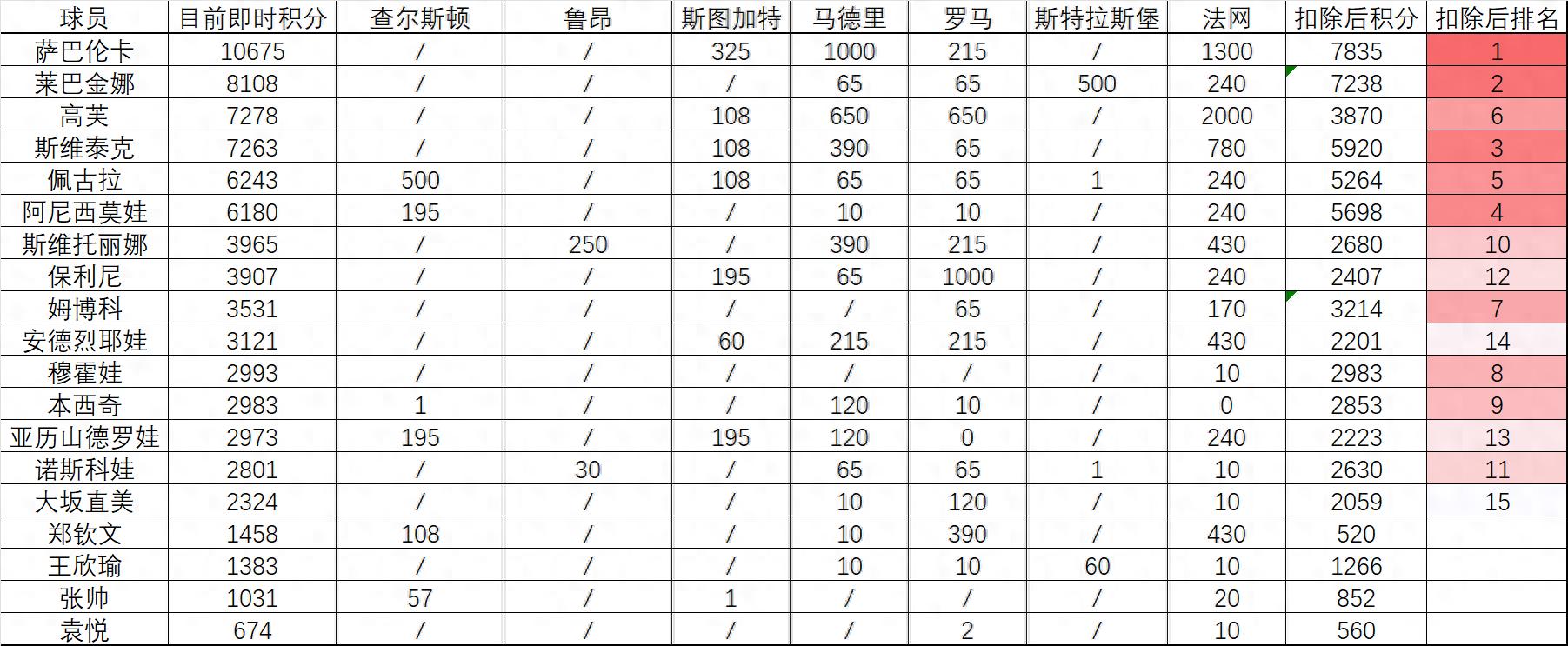 因此,小编也提前跟大家来看看目前Top15和部分中国球员在红土赛季的保分压力,以及可能存在的名次变化。