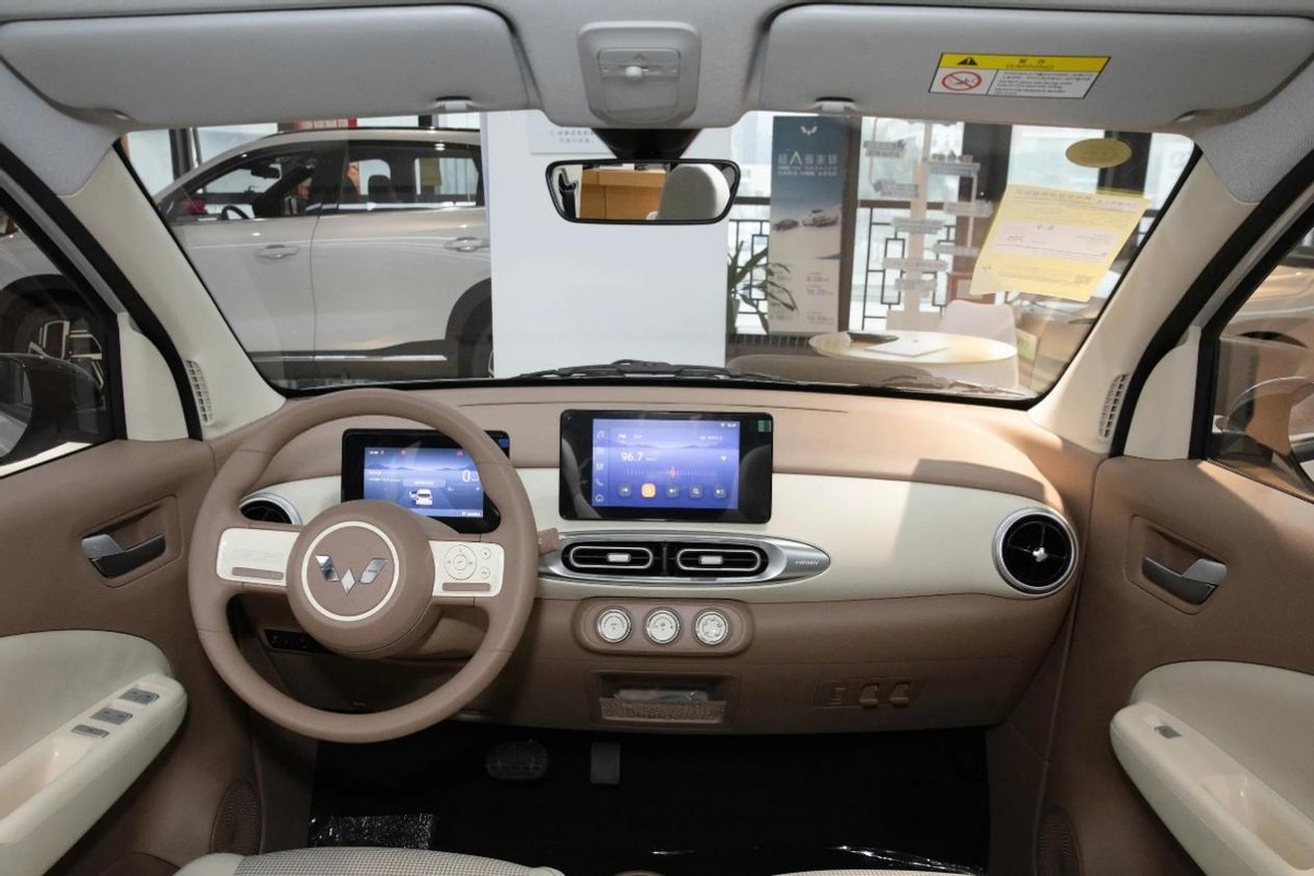2025款五菱宏光MINIEV四门版配备8英寸悬浮式中控屏(入门版未标配)和7英寸仪表盘,换挡方式为旋钮式,两侧空调出风口造型采用圆形,整体的造型复古可爱,但少了一些智能化方面的体验。