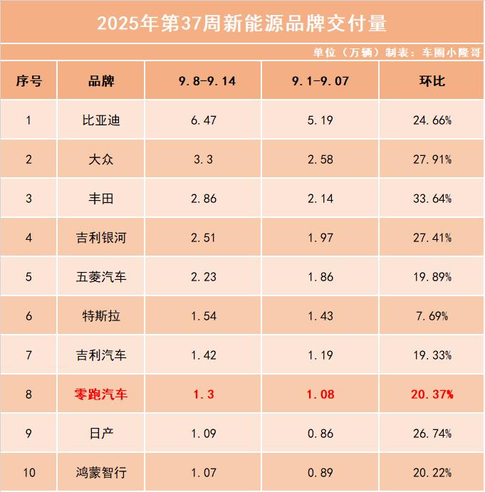 根据最新一周的(9月8日-9月14日)终端销量数据,像吉利银河、五菱汽车和零跑都进入了前十。零跑汽车以1.3万辆成绩首次挺进全品类乘用车周销量榜前十,销量高于日产、鸿蒙智行!