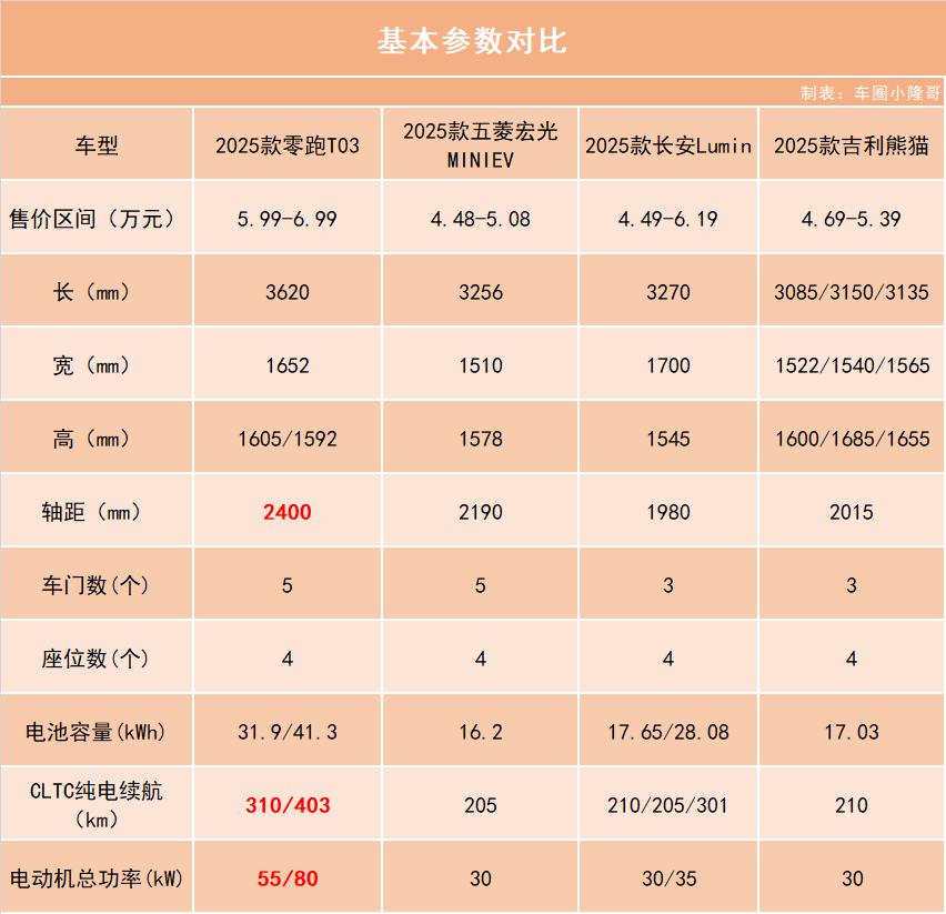 售价方面,零跑T03的入门版售价,比2025款的五菱宏光MINIEV入门版贵了1.51万元,但轴距大了210毫米、电池容量多了15.7千瓦时、电机功率高了25千瓦、续航里程多跑96公里!所以,选择四门四座的用户,我更推荐零跑T03。