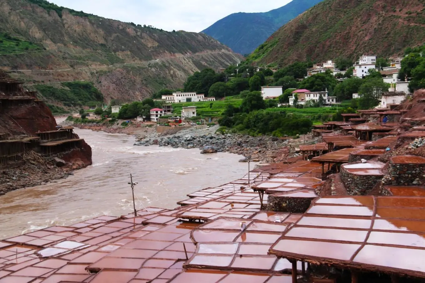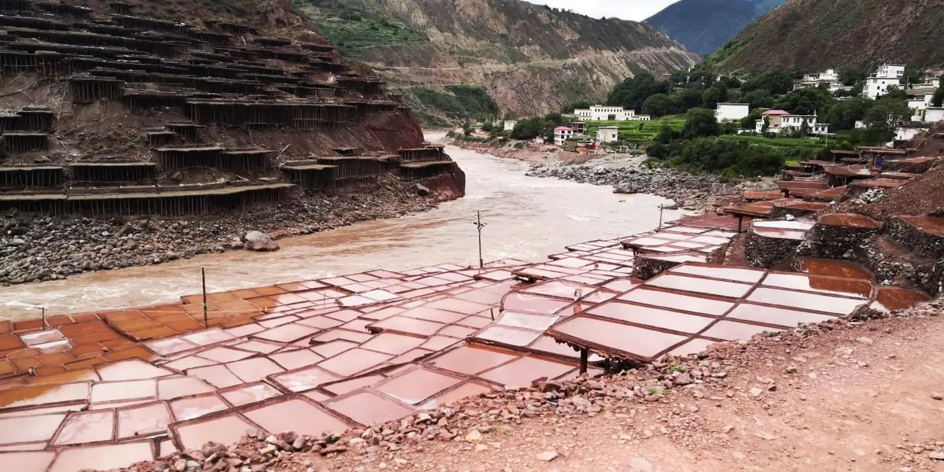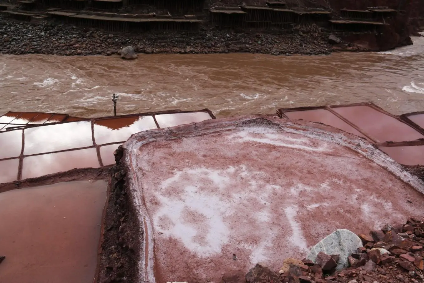 近处看看这注满卤水的 盐田 ,就算没有阳光,对比涛涛奔流的江水, 盐田 表面就像明镜一般反射天空的颜色,哪怕只有那么一点蓝天也会呈现不一样的颜色,至于那一池碧水可能是卤水池,人们从这池中再把卤水注到 盐田 中去。