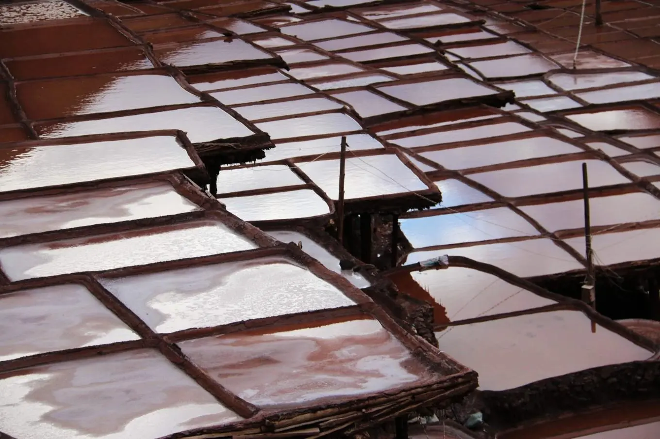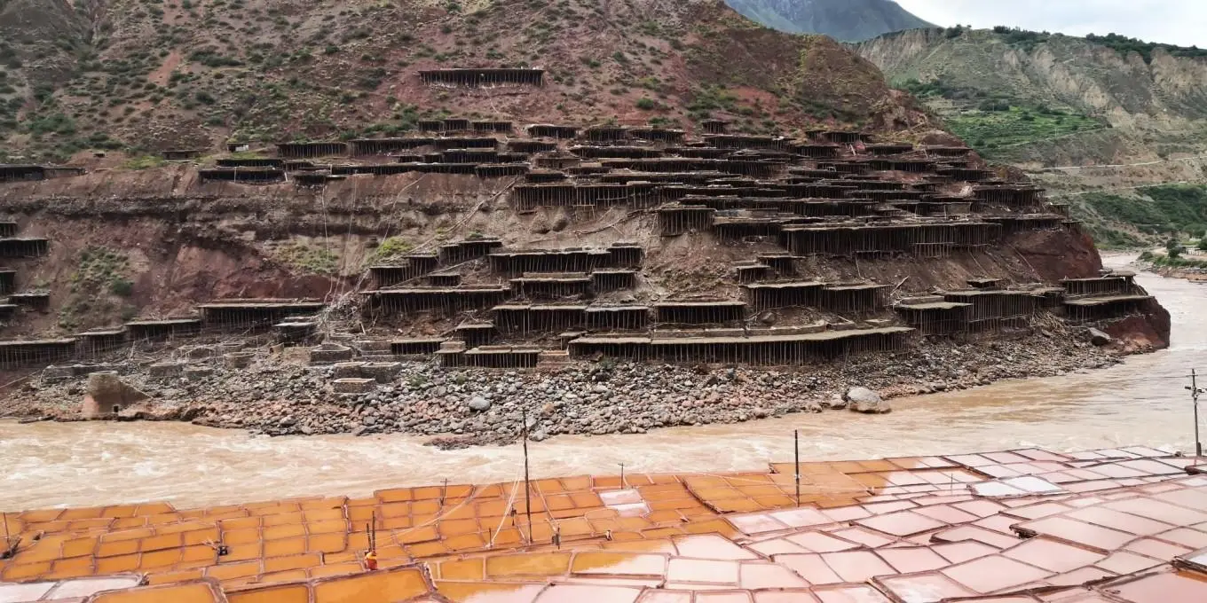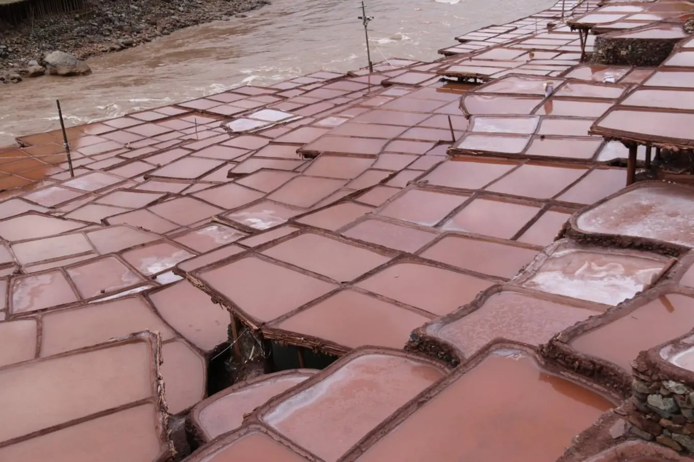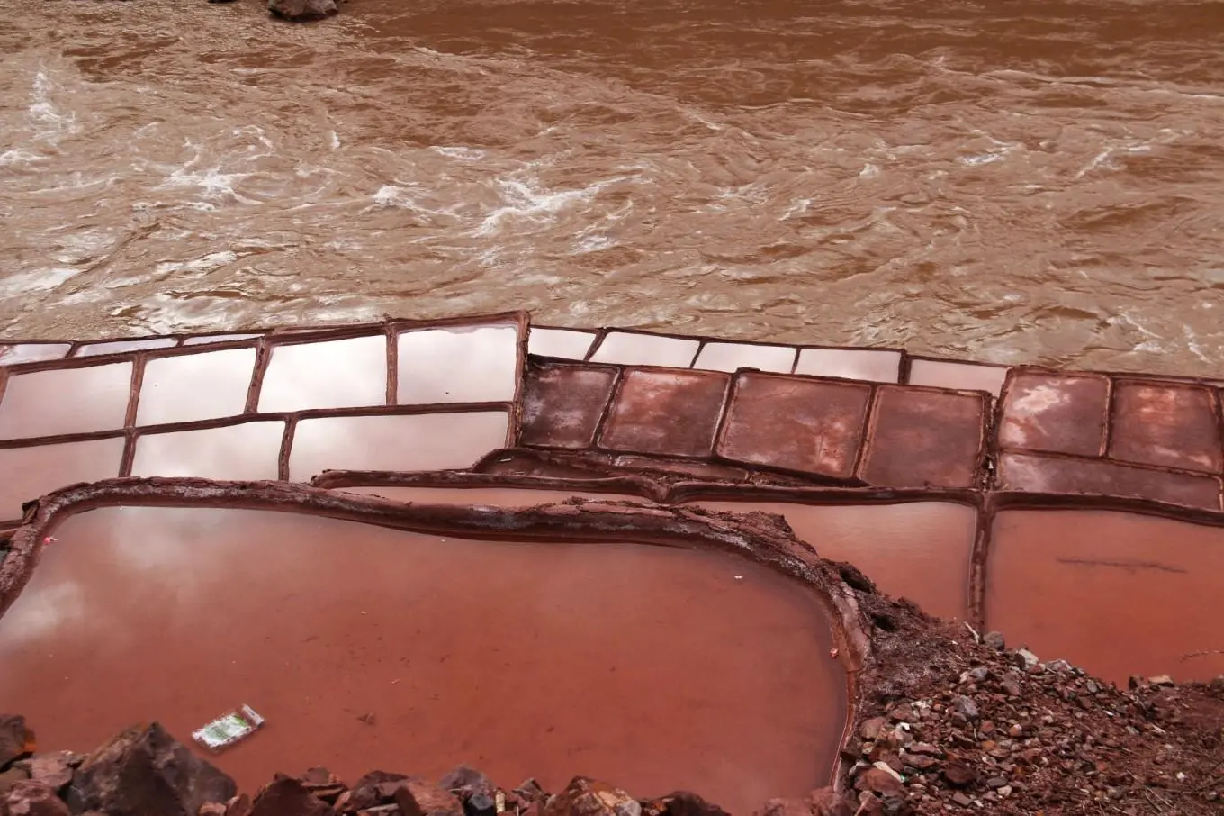 近处看看这注满卤水的 盐田 ,就算没有阳光,对比涛涛奔流的江水, 盐田 表面就像明镜一般反射天空的颜色,哪怕只有那么一点蓝天也会呈现不一样的颜色,至于那一池碧水可能是卤水池,人们从这池中再把卤水注到 盐田 中去。