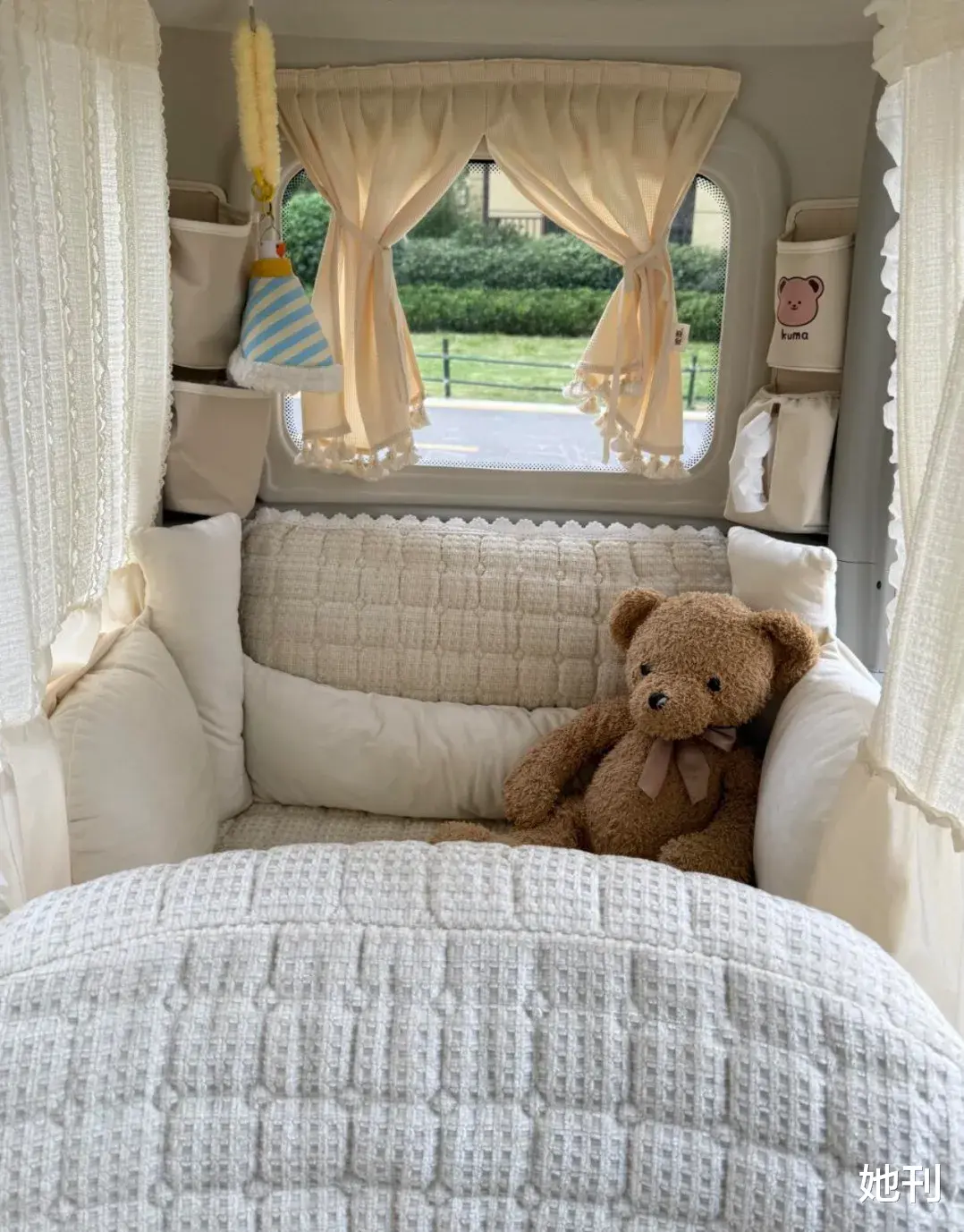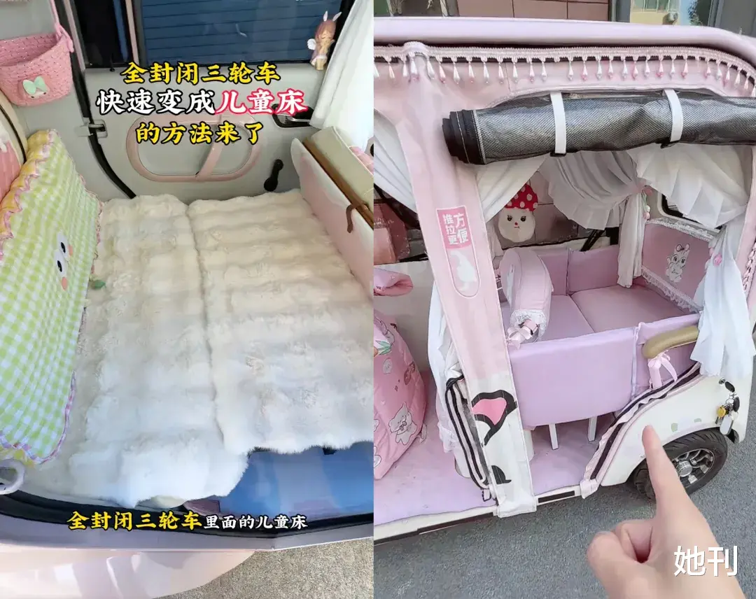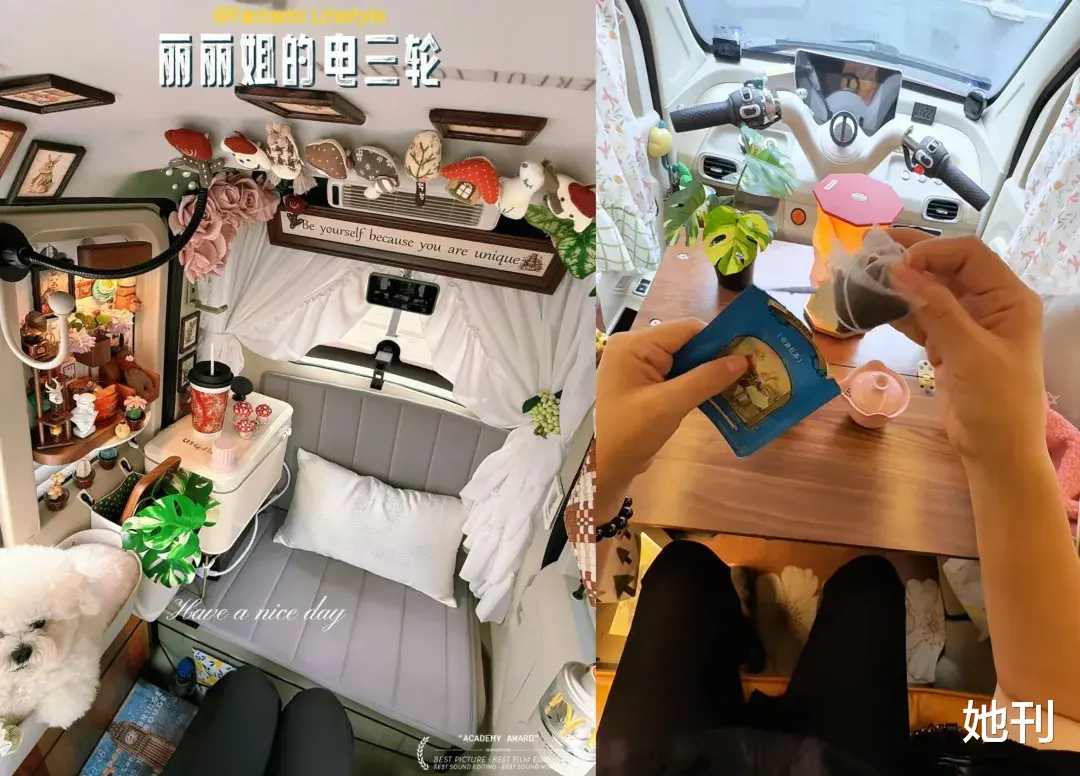 甚至,在一些宝妈们的爆改下,电动三轮车早已不再是一个交通工具,而成了妈妈们专为自己打造的秘密基地和移动城堡。