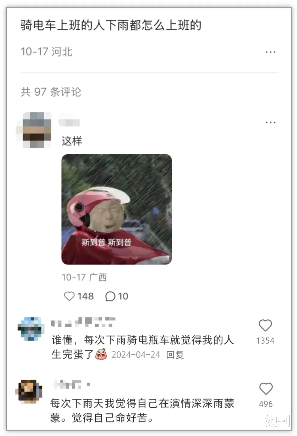 “小电驴什么都好,就是下雨的时候显得我命很苦”。
