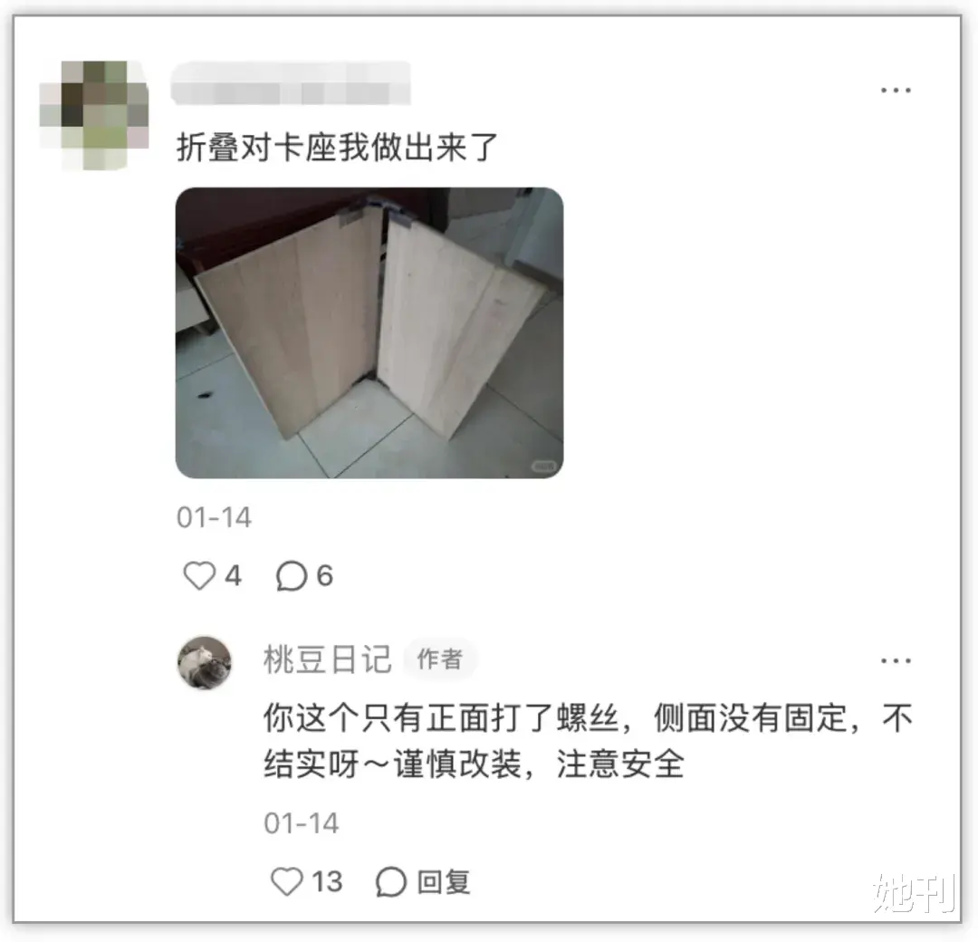 有县城宝妈博主捡起过去做工程设计时的知识和经验,从锯木板、拧螺丝做起,自制了一个集驾驶座、床、桌子、卡座于一体的四合一座椅。