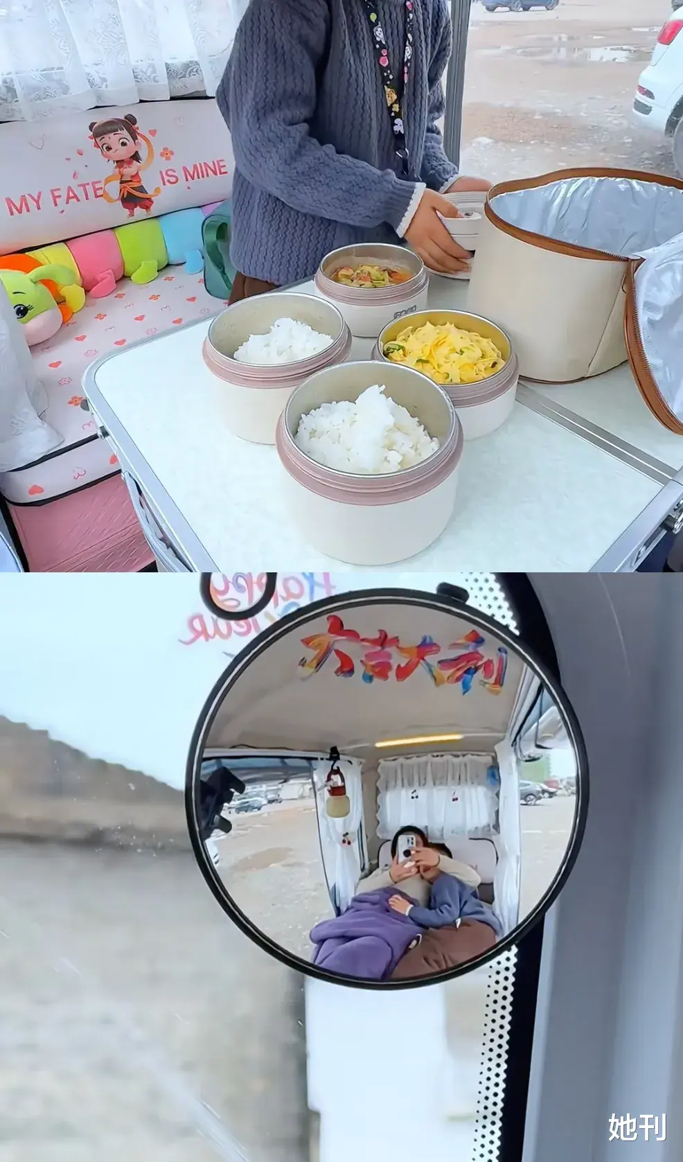 她们在车顶贴上复古装饰画,挂上暖黄色氛围灯,在侧边摆满五颜六色的小物件,和一盆充满生命力的绿植。空闲时,她们会从座位底下抽出木板,架起折叠桌,为自己泡一壶热茶。