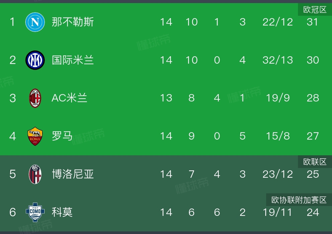 正所谓几家欢喜几家愁,比赛的输赢也直接影响了积分榜的排名。在争冠区,那不勒斯以31分反超了米兰双雄,再次登顶第一,国际米兰一分之差紧随其后。而少赛一轮的AC米兰暂时位于第三,不过对于他们而言,只要拿下本轮的胜利,依旧可以再次反超登顶。意外爆冷的罗马只能屈居第四,并且分差也被进一步拉大。