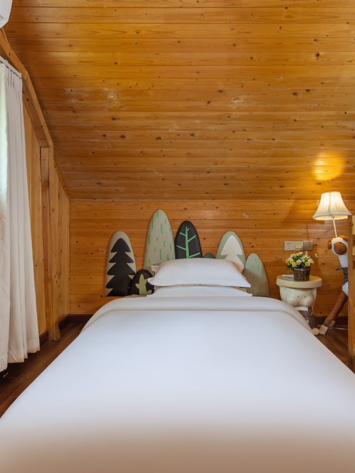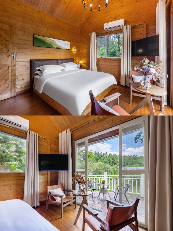 每间木屋别墅均有观景阳台,在房间便能感受湖光山色。部分房型配置家庭养生露天私泉,让您保有私密性的同时享有温泉体验。