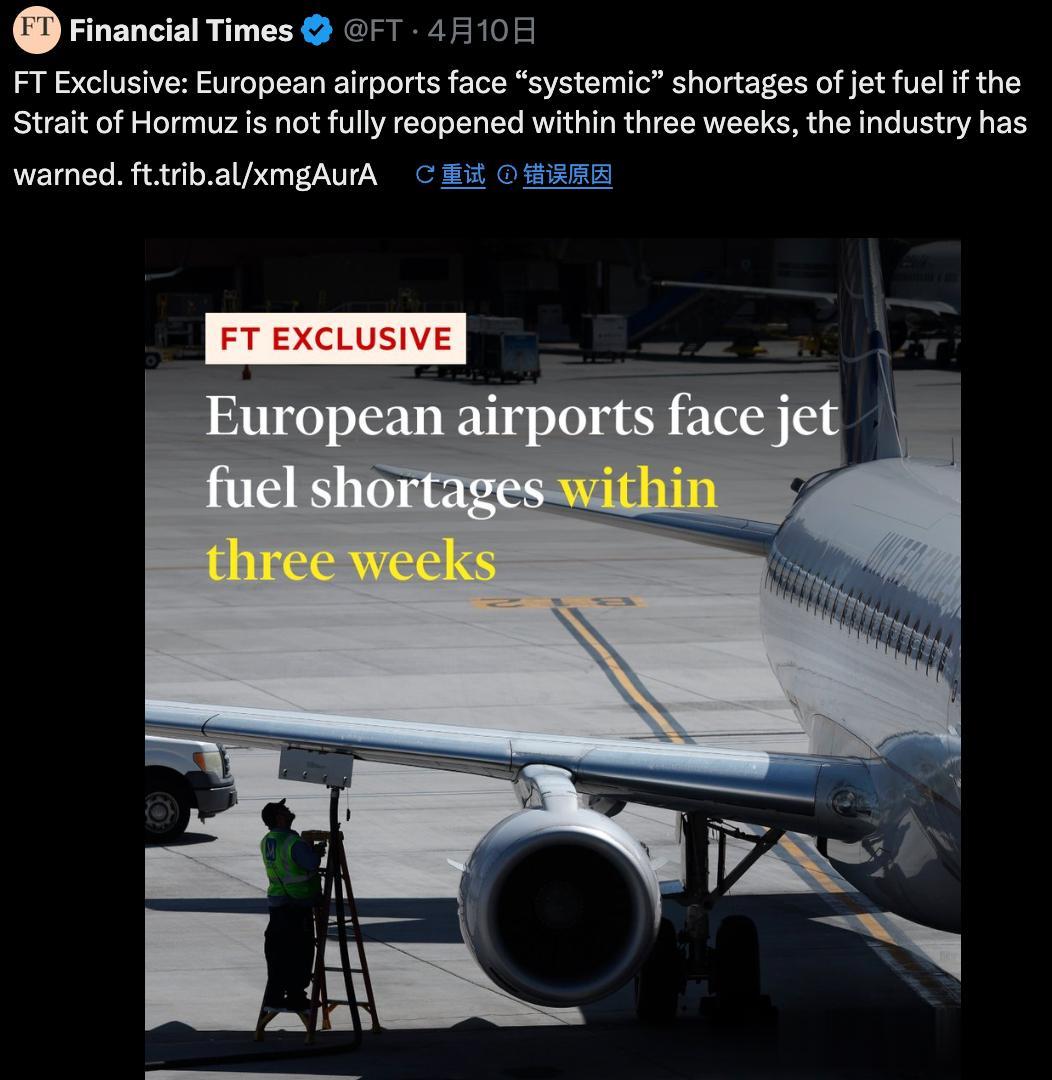 《金融时报》报道,航空业警告称,如果霍尔木兹海峡三周内不能完全重新开放,欧洲机场将面临 “系统性” 航空燃油短缺。