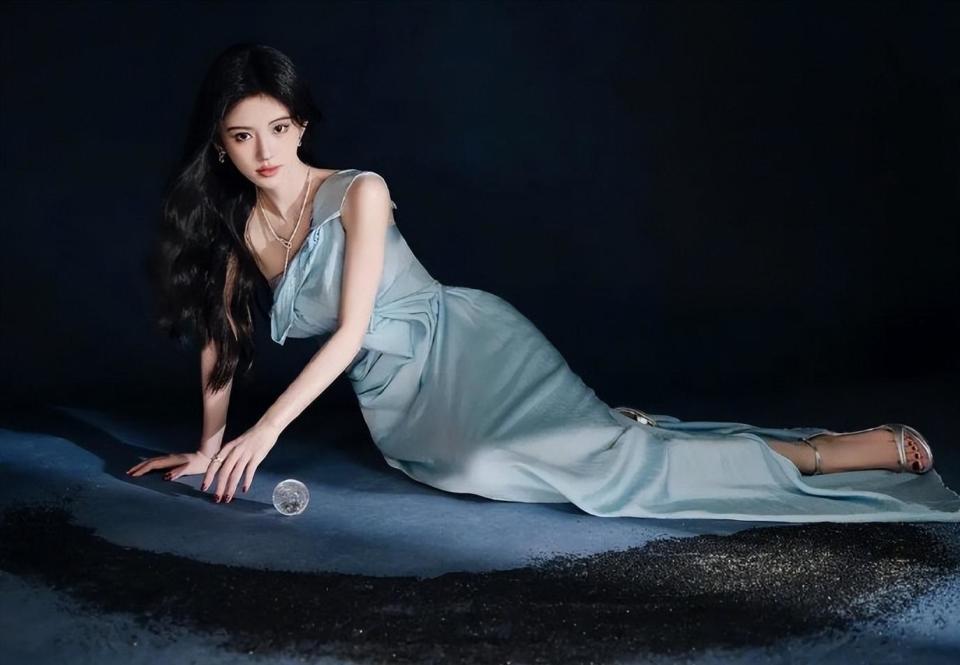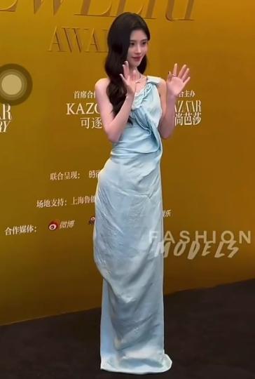 鞠婧祎算是最先登场的明星,这次她穿了Peet Dullaert 2025春夏高级定制的冰蓝色斜肩长裙。