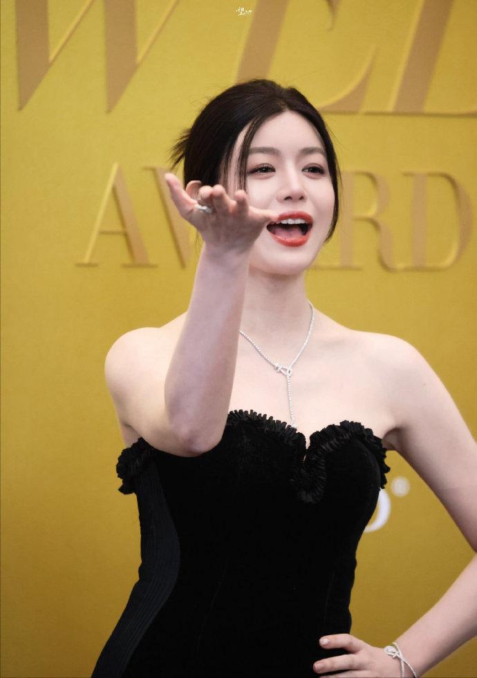 仔细看,晚宴灯光一打看着确实珠光宝气,尤其是她那张脸,怼脸拍都没在怕的,五官精致得像画出来的。