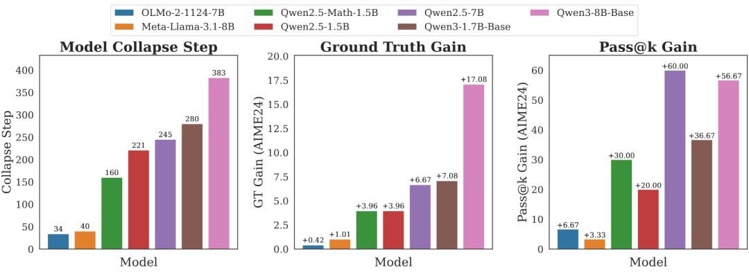 研究者找到了一把尺子:模型坍塌步数(Model Collapse Step),去测量一个模型在内在奖励训练下,能撑多少步才完全崩溃。逻辑很简单,如果崩溃越晚,说明模型的初始先验越好,它本身就掌握更多正确知识,只是不够自信;而这种先验,恰恰是标准有监督 RL 能够放大的东西。换句话说,内在奖励的崩溃点,就是模型 “RL 可训练性” 的天然指示器。