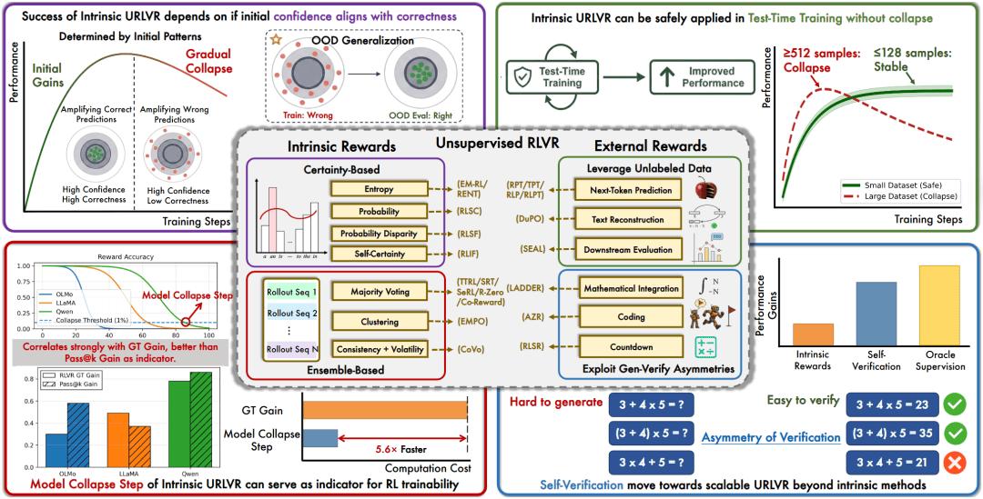 统一理论框架:把看似五花八门的内在奖励方法归到同一个机制下,揭示它们殊途同归的本质 —— 锐化模型初始分布,并给出理论收敛边界。 大规模实证:11 个模型 × 5 种内在奖励方法 × 超参数扫描,用数据说话,验证了 “先升后降” 不是偶然,而是普适规律。 画出安全区:不是所有场景都会崩溃。我们发现,在小规模 test-time training 中,内在奖励可以安全使用,即使初始全错也能稳定进化。 化陷阱为路标:rise and fall 不只是风险,它本身就是信息。我们用它提炼出模型先验指示器,无需跑完整条 RL 曲线,就能预判一个基模是否适合强化学习。 探路替代方案:既然内在奖励有天花板,我们就看向外部。初步探索基于生成 - 验证不对称的外部奖励方法,看它能否真正突破内在奖励的 scaling 极限。四个关键发现