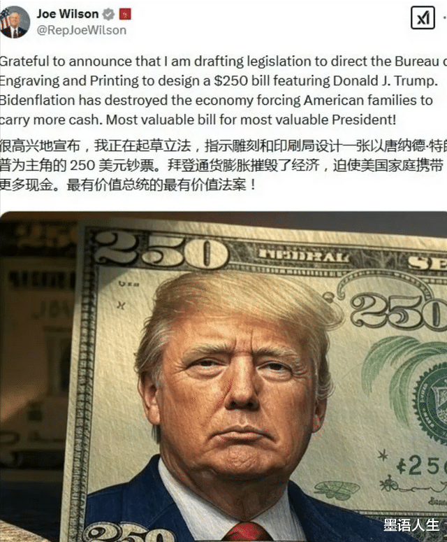——共和党议员乔·威尔逊提议将特朗普头像印在新发行的250美元钞票上,声称“最有价值的总统配得上最大面额”,却在跨文化语境中撞上了“250”这个中文里的戏谑暗号。
