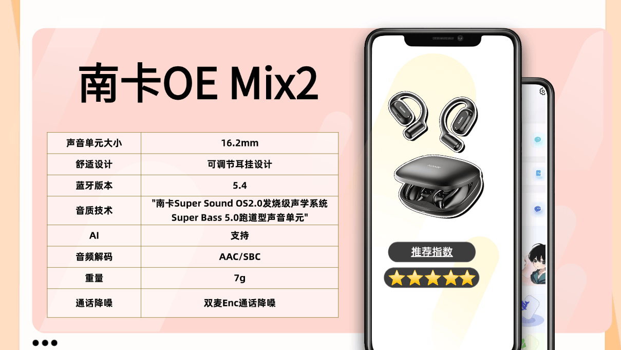为了极致的声音表现,南卡专门成立高规格开放式声学实验室,聚焦一款产品连续打磨数年,迭代升级30余个版本、优化100多个声学细节,只为把音质推向极限。全新Super Sound OS2.0发烧级声学系统,集成FC超感知动态补偿、DSAE全频谱智能调校、高通无损传输以及AAO自适应音质优化四大核心方案,全方位还原声音本真,呈现纯净而个性化的听觉体验。同时,它还融合Ai功能,集成讯飞、DeepSeek等多模态南卡AI智能系统,满足翻译、交互、创作等多场景需求,让耳机从“好声音”进化为全能伙伴。凭借智能+音质的双重优势,OE Pro2已获得500+数码博主与60+媒体一致认可,成为开放式耳机行业独一档的音质与功能标杆。