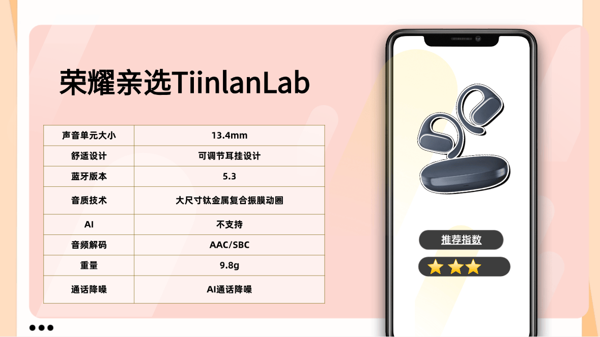 荣耀亲选TiinlanLab耳机结构挑耳朵,佩戴效果因人而异,单耳9.8克的重量,全开放空气感佩戴设计,能听到环境音,过马路、户外跑步更安全,硅胶材质算舒服的。音质方面,最大的卖点是13.4mm大尺寸钛金属振膜 。声音比较清晰,听人声、乐器细节不糊。高频比较亮,适合听女声、弦乐。低音音乐一般,而且容易被环境音盖过。