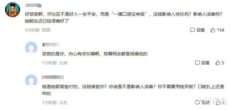 对此,还有网友评论道:好悲哀啊,评论区不是好人一生平安,而是“一摸口袋没有钱”,没钱影响人快乐吗?影响人活着吗?她能生还已经很美好了
