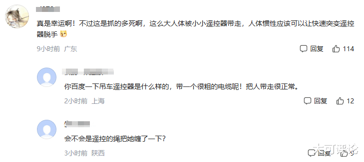 也有网友不了解吊车的遥控器,当时电光火石之间,确实一下子就被带飞出窗外了!